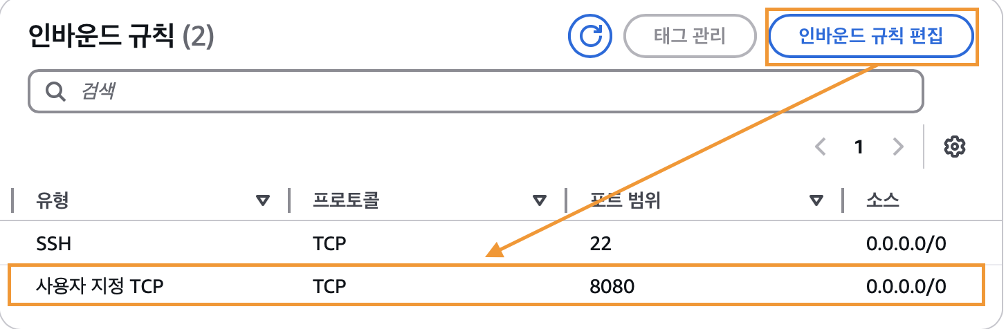 해당 포트로 퍼블릭DNS에 접근하기 위해서는 만들어둔 ec2 인스턴스 보안그룹에 8080포트가 열려있어야 하니 보안그룹 인바운드 규칙에 8080포트를 추가해주자.