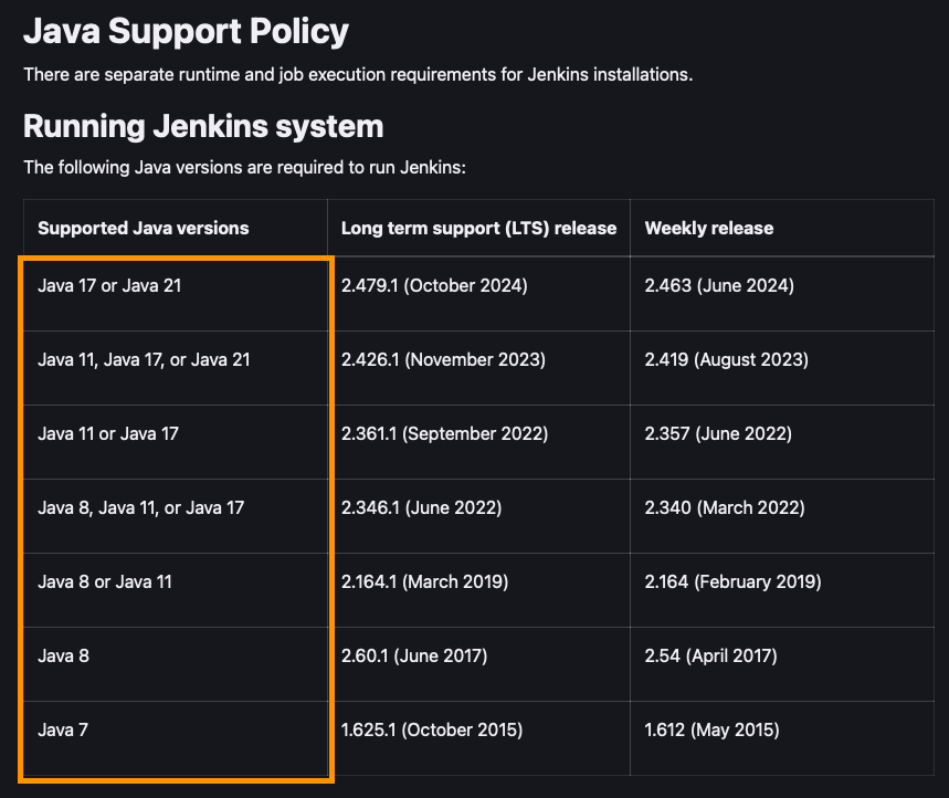 Jenkins 공식 문서에 지원되는 자바 버전별로 정리되어있는데, 가장 최신 버전의 jenkins를 이용할 계획이기 때문에 java 17 버전을 다운로드 받도록 하겠다.
