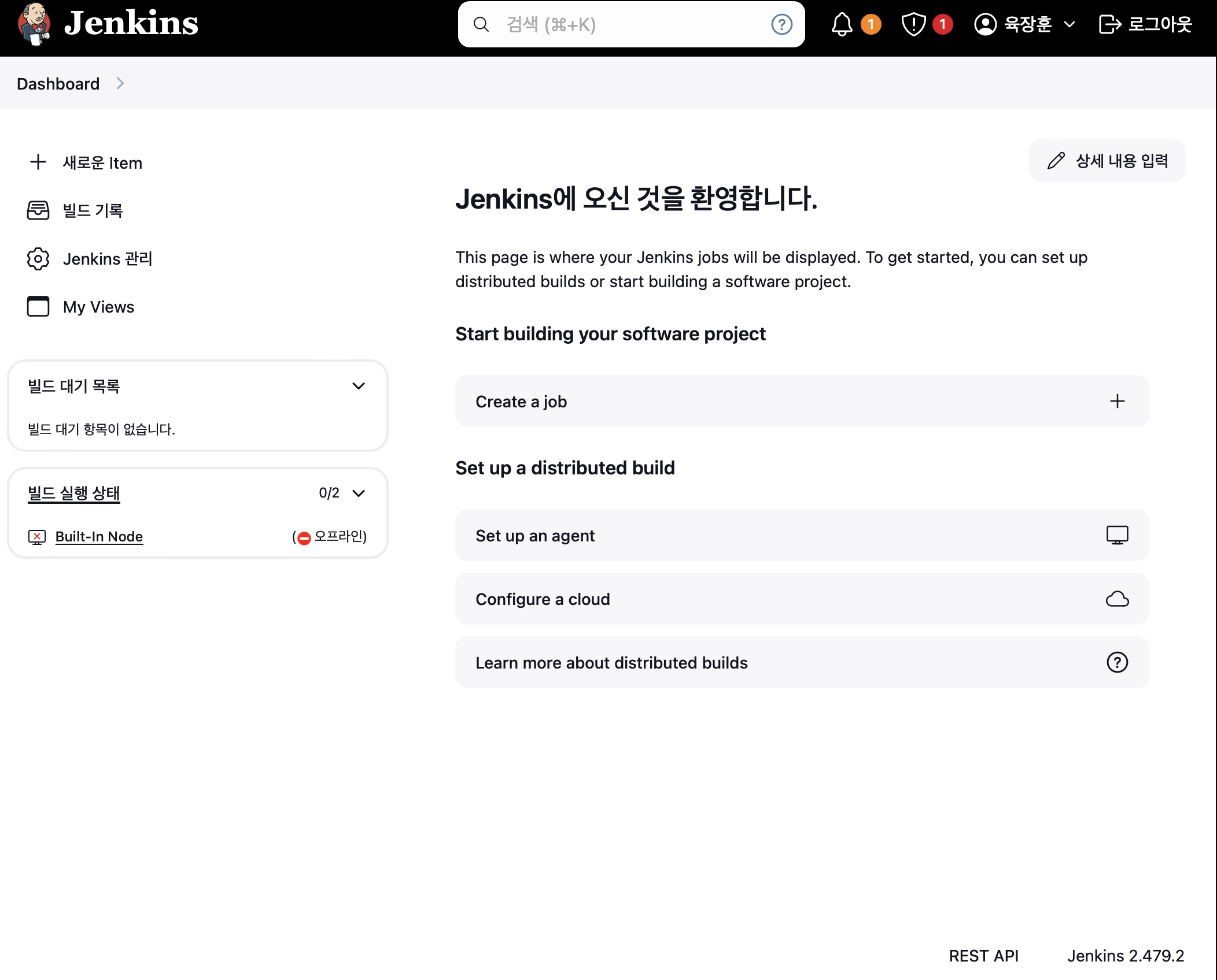 생성한 계정으로 jenkins에 로그인하면 익숙한 그 화면을 볼 수 있다. jeknins 설치만 끝났는데 벌써 구축 끝낸거 같은 기분