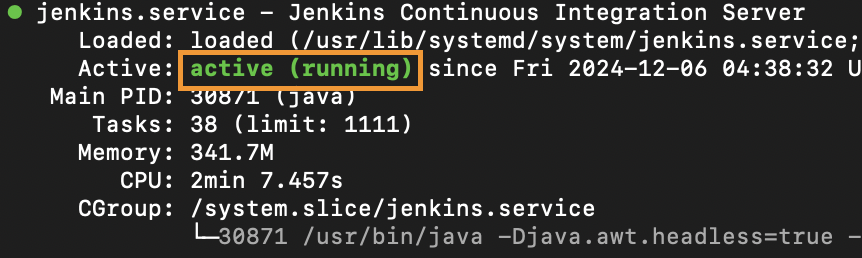 sudo systemctl start jenkins 명령어로 시작후 sudo systemctl status jenkins 다음 명령어로 확인했을때