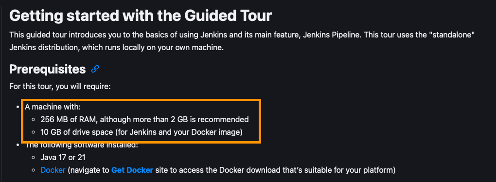 찾아보니 젠킨스 문서에서 권장하는 최소 사양은 256MB RAM에 2GB의 저장공간이 필요하다고 나와있다. (도커를 사용할 경우 10GB의 저장공간)